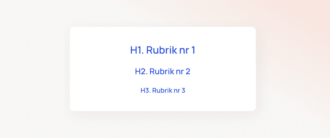 För största möjliga tydlighet vill du se till att rubrikerna följer en hierarkisk struktur, precis som i en akademisk uppsats. Tvinga inte in flera underrubriker om det inte är naturligt eller passar för innehållet på sidan. Många gånger går det bra att stanna på H2-nivån.